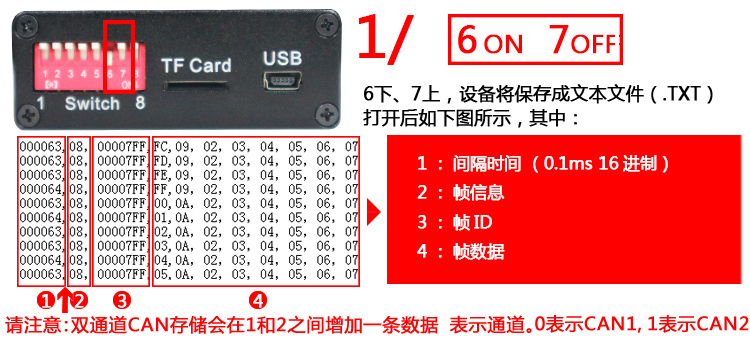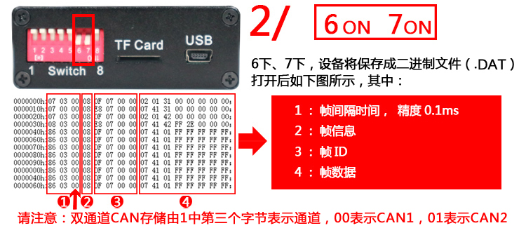 CAN總線數(shù)據(jù)存儲(chǔ)器支持四種保存數(shù)據(jù)格式:1)文本文件(.TXT)、2)二進(jìn)制文件(.DAT)、3)vector軟件支持的文件(.ASC)、4)批處理文件(.CAN)??赏ㄟ^8位撥碼開關(guān)中的第6、7兩個(gè)開關(guān)切換。切換方式如下圖所示:
