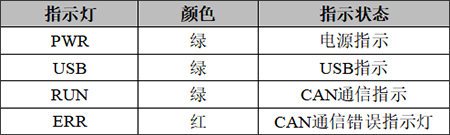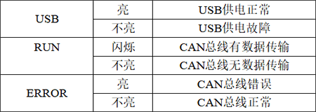 USB接口及電源接口連接,打開供電開關(guān),供電正常后,PWR指示燈會亮;當(dāng)CAN端有數(shù)據(jù)傳輸時(shí)相應(yīng)通道的RUN燈會亮;當(dāng)CAN總線產(chǎn)生錯(cuò)誤時(shí)ERR會亮。