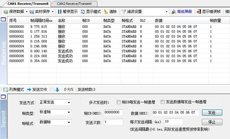 接收和發(fā)送界面是ECANTools的主要功能,在此界面,用戶可以直觀的看到接收到的CAN報(bào)文,以及通過普通發(fā)送或列表發(fā)送的方式,向總線上發(fā)送數(shù)據(jù)。
