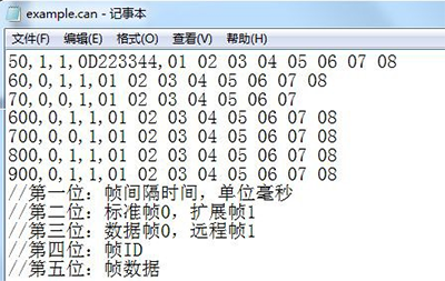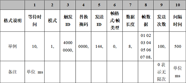 此條數(shù)據(jù)的功能是:上電等待10ms,初始化CAN1通道收發(fā)數(shù)據(jù),不設(shè)置觸發(fā),不替換ID和數(shù)據(jù),發(fā)送ID 144,標(biāo)準(zhǔn)幀,數(shù)據(jù)長度8位,發(fā)送數(shù)據(jù)01 02.....08,發(fā)送次數(shù)100次,每次發(fā)送時(shí)間間隔500ms。