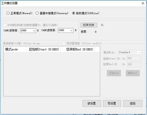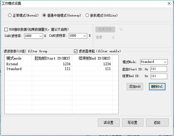 濾波設(shè)置:通過編輯濾波ID的方式,實(shí)現(xiàn)多段濾波。