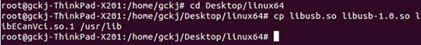4、進(jìn)入U(xiǎn)SBCAN驅(qū)動文件夾,拷貝libusb.so、libusb-1.0.so、libECanVci.so.1到gcc編譯庫目錄下。(默認(rèn)路徑為/usr/lib)輸入:cp libusb.so libusb-1.0.so libECanVci.so.1/usr/lib(默認(rèn)路徑為/usr/lib)