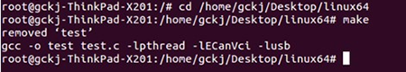 7、運(yùn)行測試程序測試USBCAN收發(fā)。輸入:./test