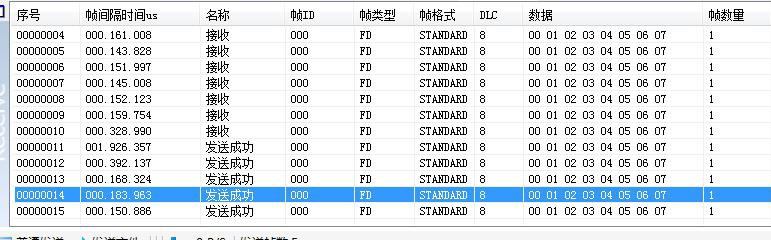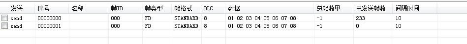 當(dāng)設(shè)置好后,可將CAN報(bào)文添加到發(fā)送隊(duì)列中:這時(shí)用鼠標(biāo)點(diǎn)擊send左邊的方框可控制發(fā)送還是停止;當(dāng)發(fā)送結(jié)束后復(fù)選框自動(dòng)回復(fù),循環(huán)發(fā)送的數(shù)據(jù)包在“已發(fā)送幀數(shù)”中可以看到成功發(fā)送的數(shù)據(jù)包數(shù)量。