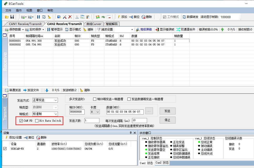 紅框內(nèi)CAN FD選項(xiàng),勾選之后為使能CANFD,幀類型會(huì)變成FD,取消勾選則不能接受CANFD數(shù)據(jù),只能接受CAN2.0數(shù)據(jù)。Bit Rate Switch選項(xiàng),勾選之后為使能可變波特率。