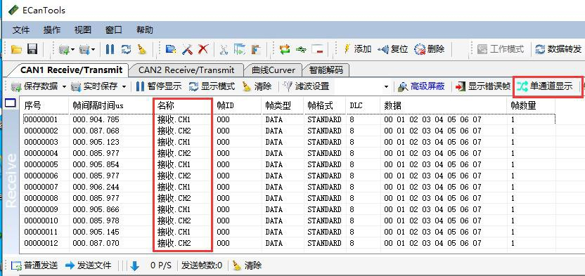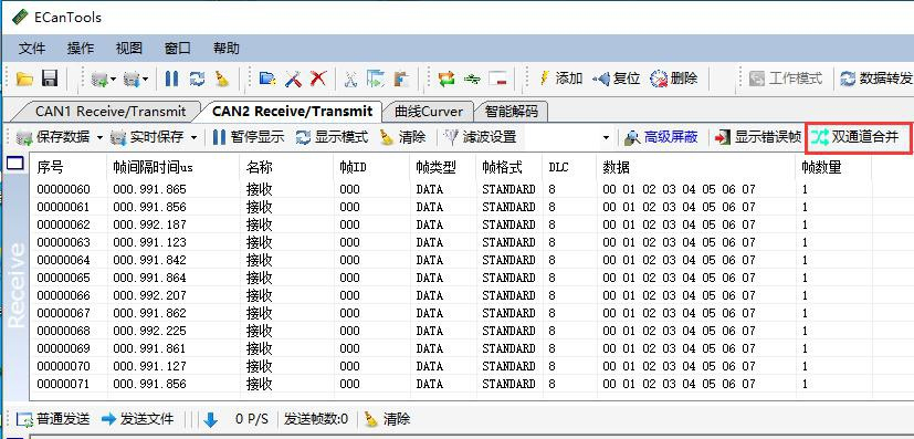對于雙通道設(shè)備,CAN1和CAN2同時(shí)接收數(shù)據(jù)時(shí),點(diǎn)擊“雙通道合并”,則在當(dāng)前界面可以收到兩個(gè)通道的接收數(shù)據(jù),并在名稱處予以區(qū)分。