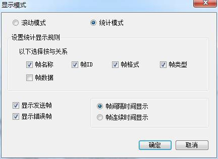 滾動(dòng)顯示是接收到的數(shù)據(jù)在接收列表中不停的向下滾動(dòng),當(dāng)前窗口看到的是最新的數(shù)據(jù);統(tǒng)計(jì)列表方式是按設(shè)置好的規(guī)則分類顯示,如可設(shè)置同一ID的數(shù)據(jù)包顯示統(tǒng)計(jì)在一起,后面有統(tǒng)計(jì)包數(shù)量。統(tǒng)計(jì)模式可方便工程師抓取總線上新產(chǎn)生的或有變化的數(shù)據(jù)。