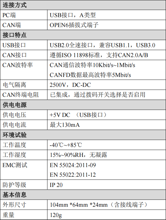 (1)PC接口符合USB2.0全速規(guī)范,兼容USB1.1及USB3.0;(2)集成2路CANFD接口,使用插拔式端子接線方式;(3)支持CAN2.0A/B協(xié)議,符合ISO 11898-1規(guī)范;(4)CAN通訊波特率在40Kbps~1Mbps之間任意可編程;(5)CANFD通訊最高波特率可支持到5M;(6)使用USB總線電源供電,或使用外接電源(DC+5V,130mA);(7)CAN(FD)-bus接口采用電氣隔離,隔離模塊絕緣電壓:DC 2500V;(8)最高接收數(shù)據(jù)流量:14000 fps;(9)CAN端接收報(bào)文時(shí)間戳精度可達(dá)1us;(10)支持Windows XP、7、8、10等Windows操作系統(tǒng);(12)支持ECANTools測試軟件;(13)支持二次開發(fā);(14)工作溫度范圍:-40℃~+85℃。