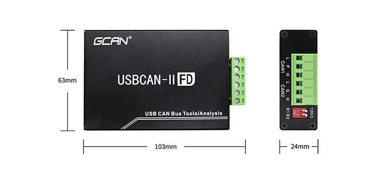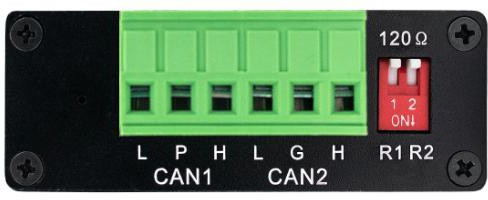 注意:USBCAN-II FD內(nèi)部已集成120Ω終端電阻,可通過撥碼開關(guān)選擇是否將電阻接入總線,撥碼開關(guān)在6pin端子旁邊,R1、R2分別對應(yīng)為CAN2、CAN1的終端電阻,撥到ON的位置即可將電阻啟用。