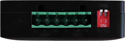 注意:USBCAN-I Pro+內(nèi)部已集成120Ω終端電阻,可通過撥碼開關(guān)選擇是否將電阻接入總線,撥碼開關(guān)在4pin端子旁邊,R1、R2兩個開關(guān)控制同一個電阻,請一起對R1、R2進(jìn)行操作,撥到ON的位置即可將電阻啟用。