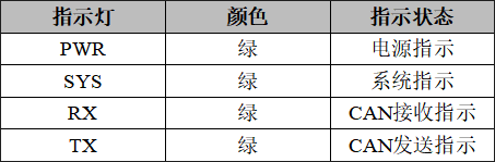 USBCAN-I Pro+接口卡具有1個PWR指示燈、1個SYS指示燈、1個RX指示燈、1個TX指示燈來指示設(shè)備的運(yùn)行狀態(tài)。這4個指示燈的具體指示功能見下表,這4個指示燈處于各種狀態(tài)下時,CAN總線的狀態(tài)如下表所示。