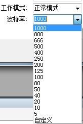 選中設(shè)備后,在下邊可以設(shè)置一些具體的工作模式和波特率。如您購買的是雙通道設(shè)備,可通過選項(xiàng)卡分別對CAN1、CAN2進(jìn)行設(shè)置,設(shè)置波特率尤為重要,此處設(shè)置波特率不可以手動輸入,需要通過下拉菜單選擇,我公司產(chǎn)品支持如圖所示標(biāo)準(zhǔn)波特率: