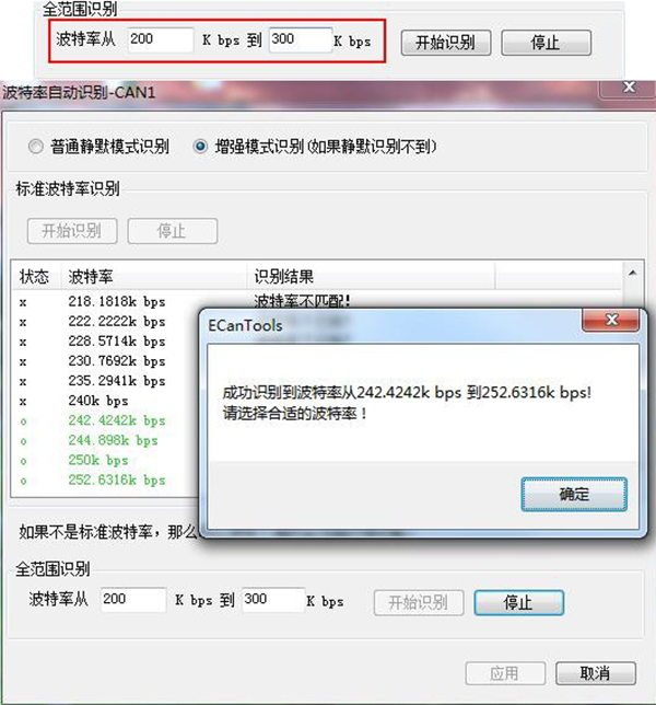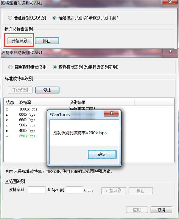 波特率自動識別功能按檢索范圍的不同,可分為兩種模式:A.標(biāo)準(zhǔn)波特率識別(對標(biāo)準(zhǔn)的CAN波特率進(jìn)行一一識別),B.全范圍波特率識別(手動輸入識別范圍,軟件將對范圍內(nèi)的波特率進(jìn)行全面匹配)。例如,某CAN總線系統(tǒng)的波特率未知,使用標(biāo)準(zhǔn)波特率識別顯示“沒有找到合適的波特率”時,您可在“全范圍識別”區(qū)域設(shè)置波特率從5kbps識別到1000kbps,即可識別到所需的波特率。