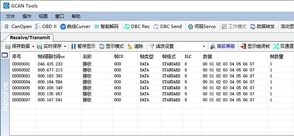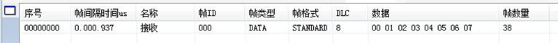 設(shè)備參數(shù)設(shè)置好后,軟件就進(jìn)入工作狀態(tài),如果總線上有數(shù)據(jù),這時接收數(shù)據(jù)窗口就會有數(shù)據(jù)顯示。接收窗口如下圖所示: