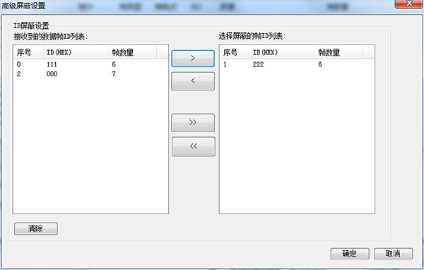 GCANTools軟件可以屏蔽接收到的指定的CAN幀數(shù)據(jù)。GCANTools軟件可以將接收到的數(shù)據(jù)按幀ID歸類后合并顯示在左側(cè)的待屏蔽列表中,從左邊的列表中您可以選擇需要屏蔽的幀ID,點(diǎn)擊向右箭頭即可將選中的幀ID添加到屏蔽列表中,軟件將自動屏蔽右側(cè)列表中所有以此幀ID開頭的所有數(shù)據(jù),屏蔽列表可以設(shè)置多條屏蔽幀ID。