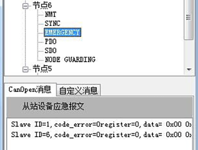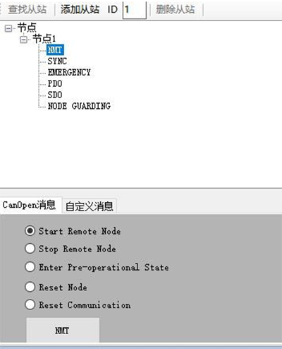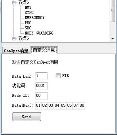 GCANTools軟件還可通過編輯自定義消息手動模擬CANopen數(shù)據(jù),用戶可直接通過編寫功能碼、從站node ID、數(shù)據(jù)的方式直接向CANopen從站發(fā)送數(shù)據(jù)。