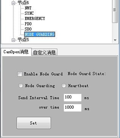 GCANTools軟件中的節(jié)點(diǎn)保護(hù)(NODE GUARDING)功能有兩種實(shí)現(xiàn)方式——主站主動發(fā)送命令來詢問從站節(jié)點(diǎn)的狀態(tài)(Node Guarding)、從站節(jié)點(diǎn)以心跳的方式周期傳送它的狀態(tài)(Heartbeat)。