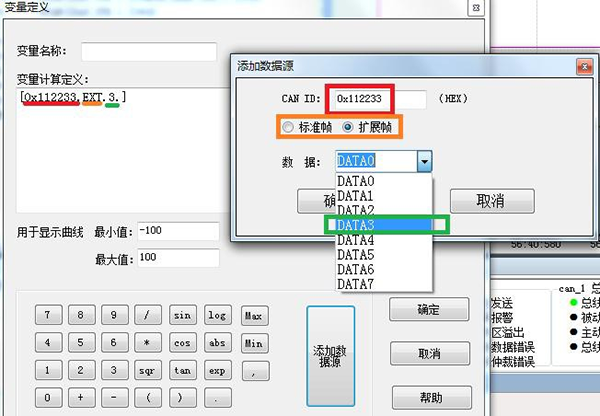 “添加數(shù)據(jù)源”就是將收到的CAN總線原始數(shù)據(jù)中某一幀的某一字節(jié)的數(shù)據(jù)作為數(shù)據(jù)源添加到變量計算定義中,添加時先點(diǎn)擊“添加數(shù)據(jù)源”,然后依次填充“CAN ID”、“標(biāo)準(zhǔn)幀(擴(kuò)展幀)”、“數(shù)據(jù)”等信息,點(diǎn)擊確定,會在“變量計算定義”中生成一條相應(yīng)的語句,該語句也可自行編寫,編寫時請遵循該格式。