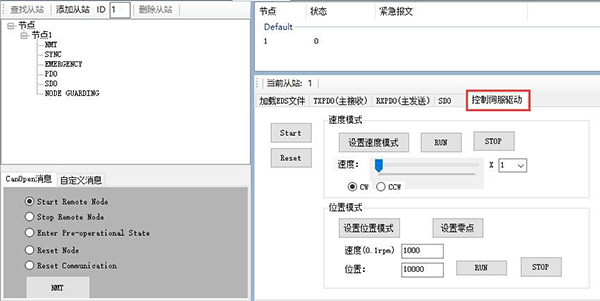 現(xiàn)階段僅開放“設(shè)置速度模式”供您對伺服電機(jī)設(shè)備進(jìn)行簡單控制。連接伺服電機(jī)設(shè)備的CAN總線后,依次點(diǎn)擊“查找從站”—“Start”—“設(shè)置速度模式”—“RUN”,即可將伺服電機(jī)驅(qū)動。