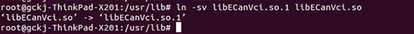 5.進(jìn)入gcc編譯庫文件夾,把libECanVci.so.1和libECanVci.so鏈接到一起。輸入:ln-sv libECanVci.so.1 libECanVci.so