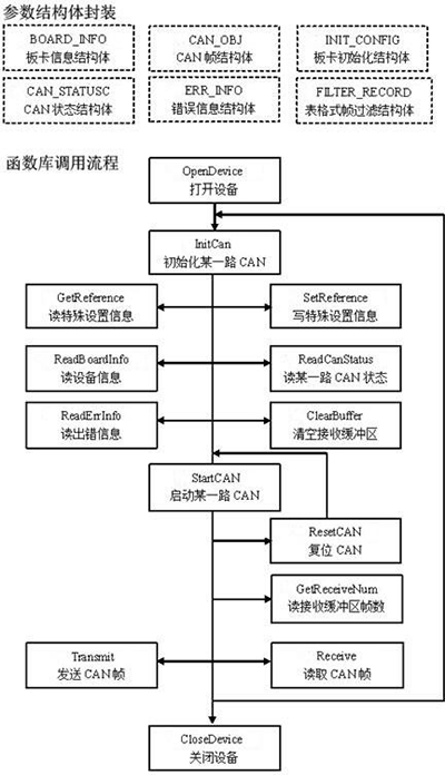 我公司為二次開發(fā)的用戶提供標(biāo)準(zhǔn)的接口函數(shù)庫,包括:ECANVCI.h、ECANVCI.lib、ECANVCI.dll。該接口函數(shù)庫均為標(biāo)準(zhǔn)格式,用戶可以在VC、VB、Labview等編程環(huán)境中,對這些接口函數(shù)聲明調(diào)用,具體使用方法詳見“ECAN動態(tài)庫使用手冊”。下圖為常用結(jié)構(gòu)體名稱及函數(shù)庫調(diào)用流程。