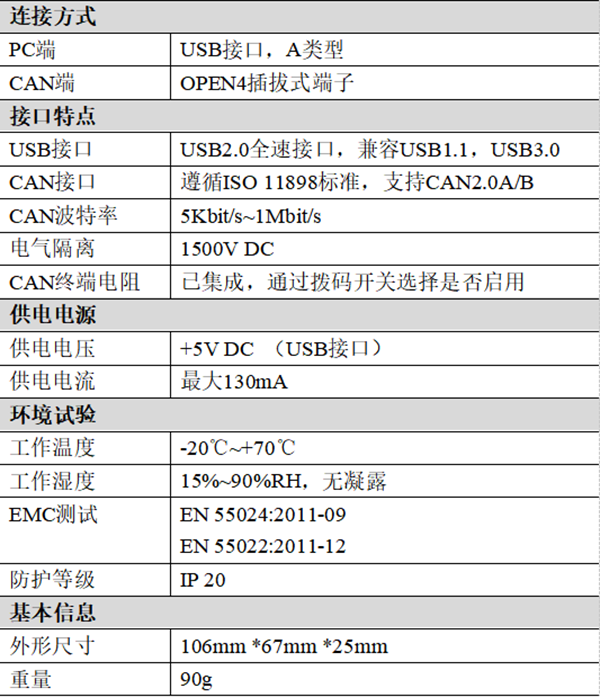 (1)PC接口符合USB2.0全速規(guī)范,兼容USB1.1及USB3.0;(2)集成1路CAN-bus接口,使用插拔式端子接線方式;(3)支持CAN2.0A和CAN2.0B幀格式,符合ISO/DIS 11898規(guī)范;(4)CAN-bus通訊波特率在5Kbps~1Mbps之間任意可編程;(5)使用USB總線電源供電(DC+5V,130mA);(6)CAN-bus接口采用電氣隔離,隔離模塊絕緣電壓:DC 1500V;(7)最高接收數(shù)據(jù)流量:14000 fps;(8)CAN端接收報文時間戳精度可達(dá)1us;(9)支持WinXP、Win7、Win8、Win10等Windows操作系統(tǒng);(10)支持Linux操作系統(tǒng);(11)支持ECANTools測試軟件;(12)工作溫度范圍:-20℃~+70℃;