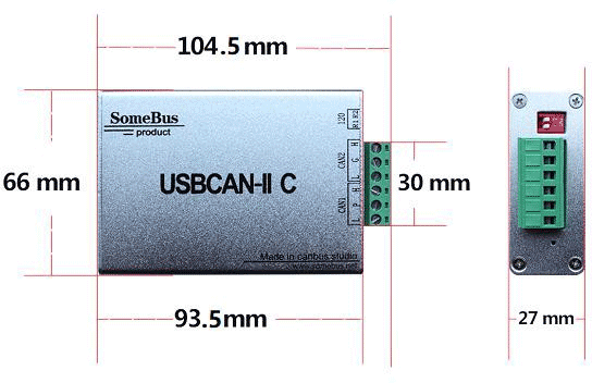 USBCAN-II C接口卡集成1路USB接口、一路+9-24V DC輔助電源接口及2路標準CAN-bus接口。CAN-bus接口由1個6 Pin插拔式接線端子引出,可以用于連接2個CAN-bus網(wǎng)絡(luò)或者CAN-bus接口的設(shè)備。