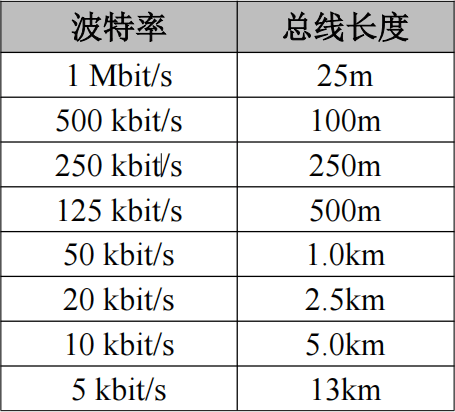 注意:CAN-bus電纜可以使用普通雙絞線、屏蔽雙絞線。理論最大通信距離主要取決于總線波特率,最大總線長度和波特率關(guān)系詳見表3.1。若通訊距離超過1Km,應(yīng)保證線的截面積大于Φ1.0mm2,具體規(guī)格應(yīng)根據(jù)距離而定,常規(guī)是隨距離的加長而適當加大。