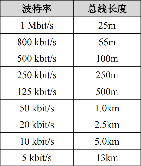 請注意:CAN-bus電纜可以使用普通雙絞線、屏蔽雙絞線。理論最大通信距離主要取決于總線波特率,最大總線長度和波特率關(guān)系詳見表3.3。若通訊距離超過1km,應(yīng)保證線的截面積大于Φ1.0mm2,具體規(guī)格應(yīng)根據(jù)距離而定,常規(guī)是隨距離的加長而適當(dāng)加大。