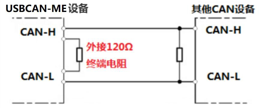 請注意:USBCAN-ME模塊內(nèi)部默認(rèn)未集成120Ω終端電阻。如果節(jié)點(diǎn)數(shù)目大于2,中間節(jié)點(diǎn)需要安裝120Ω的終端電阻。需要使用時(shí),可以聯(lián)系銷售選裝電阻,或?qū)㈦娮鑳啥朔謩e接入CAN_H、CAN_L即可,如圖3.2所示。