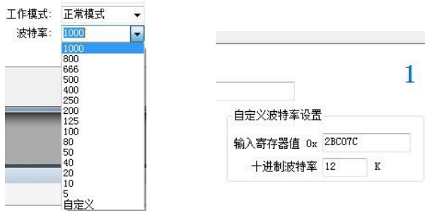 選中設(shè)備后,在下邊可以設(shè)置一些具體的工作模式和波特率。如您購買的是雙通道設(shè)備,可通過選項(xiàng)卡分別對CAN1、CAN2進(jìn)行設(shè)置,設(shè)置波特率尤為重要,此處設(shè)置波特率不可以手動(dòng)輸入,需要通過下拉菜單選擇,我公司產(chǎn)品支持如圖所示標(biāo)準(zhǔn)波特率: