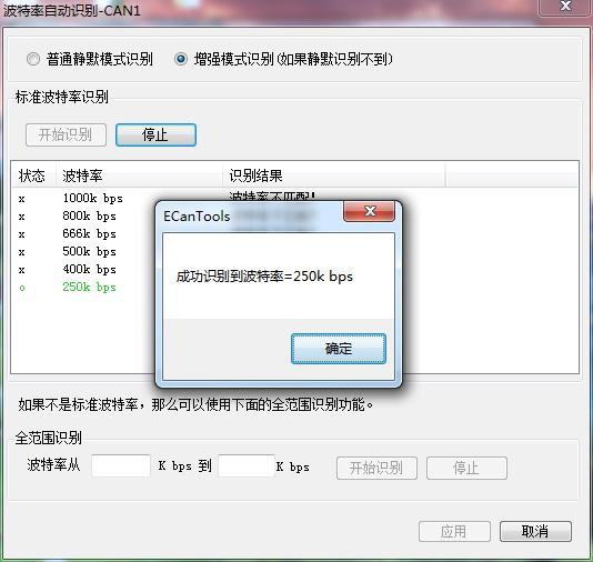 波特率自動(dòng)識(shí)別功能按檢索范圍的不同,可分為兩種模式:A.標(biāo)準(zhǔn)波特率識(shí)別(對標(biāo)準(zhǔn)的CAN波特率進(jìn)行一一識(shí)別),B.全范圍波特率識(shí)別(手動(dòng)輸入識(shí)別范圍,軟件將對范圍內(nèi)的波特率進(jìn)行全面匹配)。例如,某CAN總線系統(tǒng)的波特率未知,使用標(biāo)準(zhǔn)波特率識(shí)別顯示“沒有找到合適的波特率”時(shí),您可在“全范圍識(shí)別”區(qū)域設(shè)置波特率從5kbps識(shí)別到1000kbps,即可識(shí)別到所需的波特率。