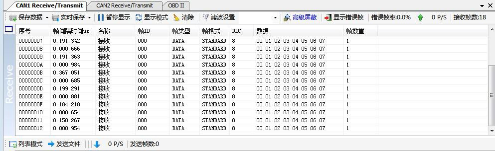 軟件可以捕獲總線上的錯(cuò)誤幀,當(dāng)接收到錯(cuò)誤幀時(shí),在接收列表中將以飄紅的形式顯示出來。