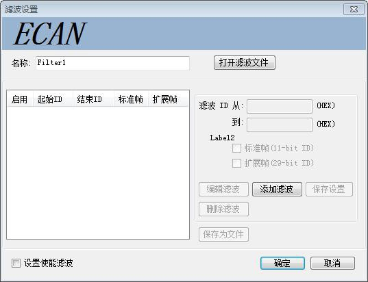 接收濾波設(shè)置可設(shè)置濾波ID或ID段,如設(shè)置濾波,軟件會(huì)只顯示被設(shè)置的濾波ID(段),不在濾波范圍內(nèi)的ID將會(huì)被過濾掉。點(diǎn)擊“編輯濾波”,彈出濾波設(shè)置窗口,可以設(shè)置濾波范圍: