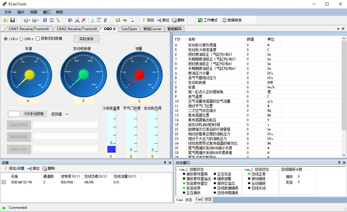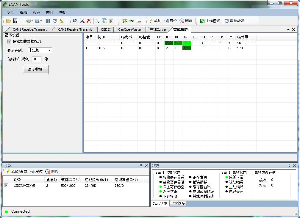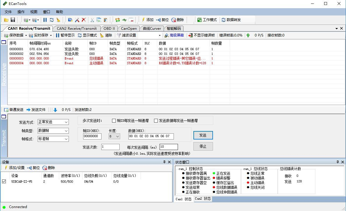 USBCAN-ME接口卡可使用我公司自主開發(fā)的ECANTools通用測試軟件,可執(zhí)行CAN-bus報(bào)文的收發(fā)和監(jiān)測等功能。