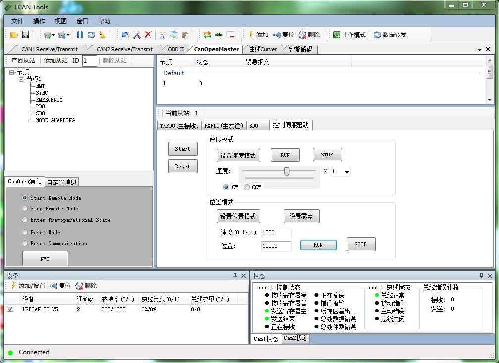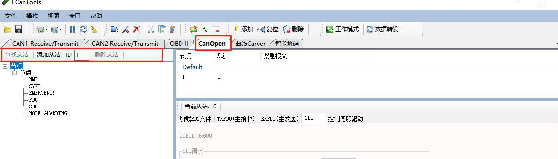 ECANTools軟件的CANopen主站功能可將USBCAN設(shè)備變成一個(gè)CANopen主站卡接入CANopen網(wǎng)絡(luò)中,使用電腦搭配USBCAN即可完成對CANopen從站控制、管理、配置等應(yīng)用。ECANTools軟件可完成多種常用CANopen主站功能,如NMT(網(wǎng)絡(luò)管理)、SYNC(同步協(xié)議)、EMERGENCY(緊急報(bào)文)、PDO(過程數(shù)據(jù)對象)、SDO(服務(wù)數(shù)據(jù)對象)、NODE GUARDING(節(jié)點(diǎn)保護(hù))。