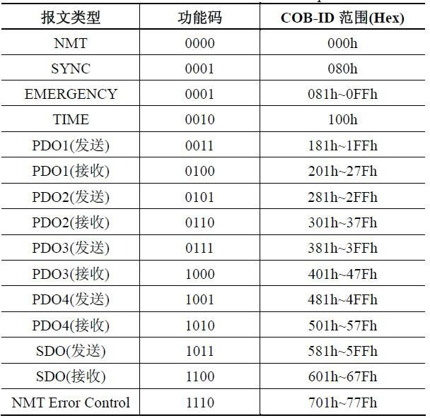 下表列出了CANopen常見報(bào)文類型所對應(yīng)的功能碼及幀ID范圍。