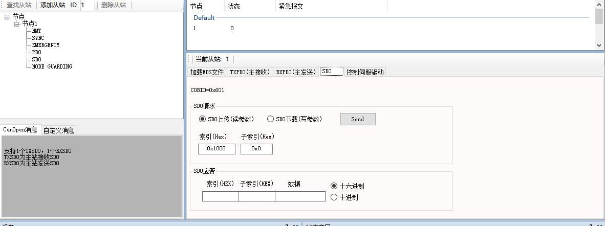CANopen主站模塊的SDO功能分為發(fā)送SDO和接收SDO,用于讀寫對象字典。SDO為服務(wù)數(shù)據(jù)對象,英文全稱Service data object,有指定被接收節(jié)點(diǎn)的地址(Node ID),并且需要指定的接收節(jié)點(diǎn)回應(yīng)CAN報(bào)文來確認(rèn)已經(jīng)接收,如果超時(shí)沒有確認(rèn),則發(fā)送節(jié)點(diǎn)將會(huì)重新發(fā)送原報(bào)文。這種通訊方式屬于常見的“服務(wù)器客戶端”的通信模型,即我們常說的輪詢式。