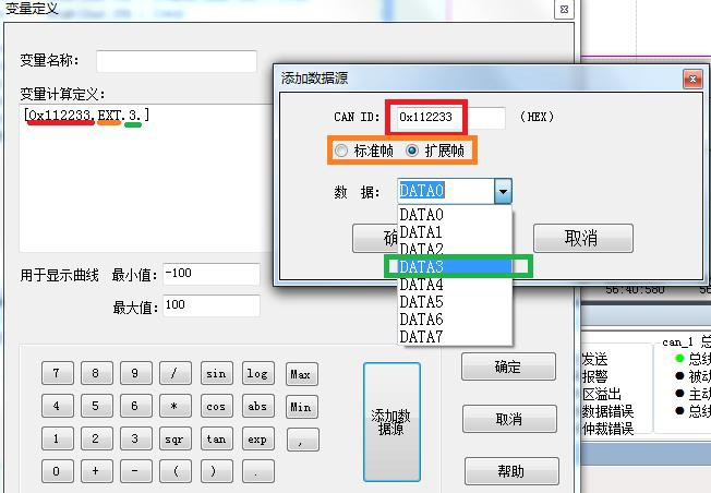 “添加數(shù)據(jù)源”就是將收到的CAN總線原始數(shù)據(jù)中某一幀的某一字節(jié)的數(shù)據(jù)作為數(shù)據(jù)源添加到變量計(jì)算定義中,添加時(shí)先點(diǎn)擊“添加數(shù)據(jù)源”,然后依次填充“CAN ID”、“標(biāo)準(zhǔn)幀(擴(kuò)展幀)”、“數(shù)據(jù)”等信息,點(diǎn)擊確定,會(huì)在“變量計(jì)算定義”中生成一條相應(yīng)的語句,該語句也可自行編寫,編寫時(shí)請遵循該格式。