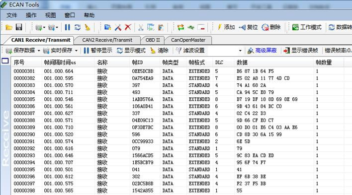 設(shè)備參數(shù)設(shè)置好后,軟件就進(jìn)入工作狀態(tài),如果總線上有數(shù)據(jù),這時(shí)接收數(shù)據(jù)窗口就會(huì)有數(shù)據(jù)顯示。接收窗口如下圖所示: