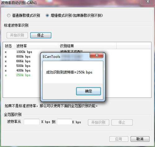 波特率自動(dòng)識(shí)別功能按檢索范圍的不同,可分為兩種模式:A.標(biāo)準(zhǔn)波特率識(shí)別(對(duì)標(biāo)準(zhǔn)的CAN波特率進(jìn)行一一識(shí)別),B.全范圍波特率識(shí)別(手動(dòng)輸入識(shí)別范圍,軟件將對(duì)范圍內(nèi)的波特率進(jìn)行全面匹配)。例如,某CAN總線系統(tǒng)的波特率未知,使用標(biāo)準(zhǔn)波特率識(shí)別顯示“沒有找到合適的波特率”時(shí),您可在“全范圍識(shí)別”區(qū)域設(shè)置波特率從5kbps識(shí)別到1000kbps,即可識(shí)別到所需的波特率。