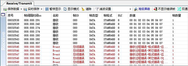 軟件可以捕獲總線上的錯(cuò)誤幀,當(dāng)接收到錯(cuò)誤幀時(shí),在接收列表中將以飄紅的形式顯示出來。