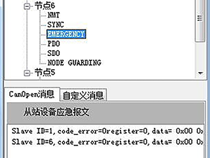 GCANTools軟件可接收到從站節(jié)點(diǎn)發(fā)出的EMERGENCY報(bào)文,該報(bào)文由出現(xiàn)緊急狀態(tài)的從節(jié)點(diǎn)發(fā)出,GCANTools軟件的CANopen主站功能可接收并處理此緊急報(bào)文。
