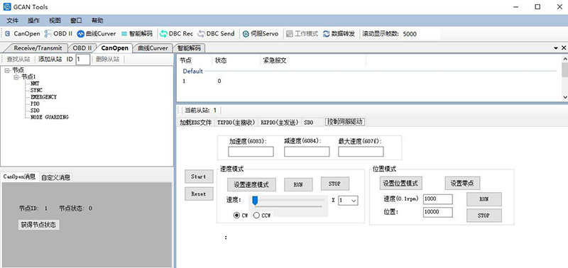 現(xiàn)階段開放“設(shè)置速度模式”“設(shè)置位置模式”供您對(duì)伺服電機(jī)設(shè)備進(jìn)行簡單控制。連接伺服電機(jī)設(shè)備的CAN總線后,依次點(diǎn)擊“查找從站”—“Start”—“設(shè)置速度模式”—“RUN”,即可將伺服電機(jī)驅(qū)動(dòng)。