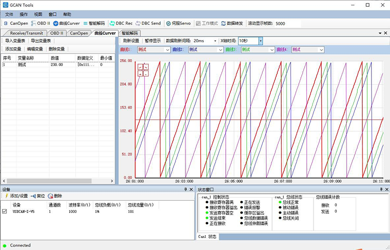 點(diǎn)擊“添加變量”“編輯變量”即可添加和編輯變量,這些變量可以對(duì)接收的CAN總線的原始數(shù)據(jù)進(jìn)行簡單的數(shù)學(xué)運(yùn)算,并在以曲線的方式顯示出來??梢蕴砑佣嘟M變量,變量名稱可包含字母,數(shù)字,漢字,空格和下劃線,方便識(shí)別。