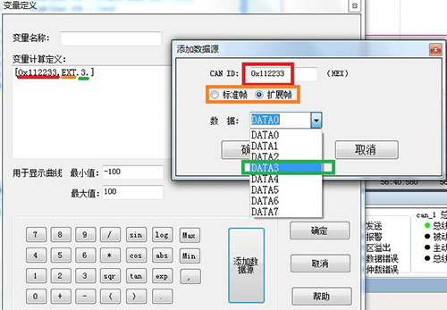 “添加數(shù)據(jù)源”就是將收到的CAN總線原始數(shù)據(jù)中某一幀的某一字節(jié)的數(shù)據(jù)作為數(shù)據(jù)源添加到變量計(jì)算定義中,添加時(shí)先點(diǎn)擊“添加數(shù)據(jù)源”,然后依次填充“CAN ID”、“標(biāo)準(zhǔn)幀(擴(kuò)展幀)”、“數(shù)據(jù)”等信息,點(diǎn)擊確定,會(huì)在“變量計(jì)算定義”中生成一條相應(yīng)的語句,該語句也可自行編寫,編寫時(shí)請(qǐng)遵循該格式。