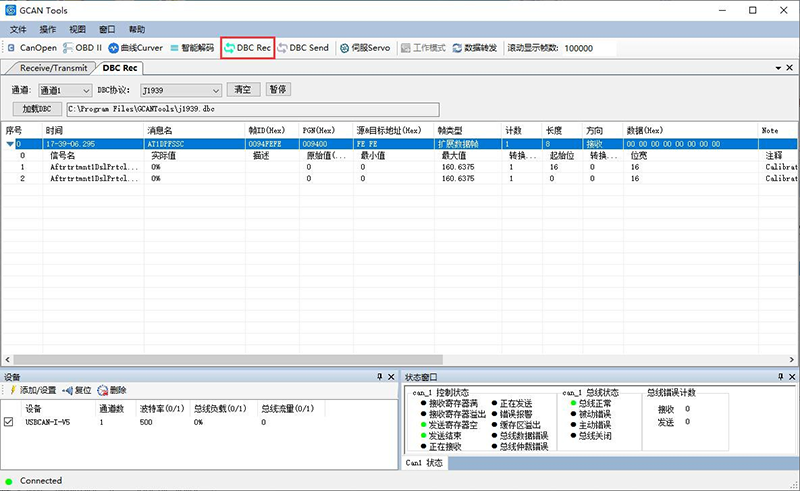 點(diǎn)擊工具欄的DBC Rec,該標(biāo)簽頁展示了原始報(bào)文按照DBC規(guī)范解析后的結(jié)果,如圖所示。