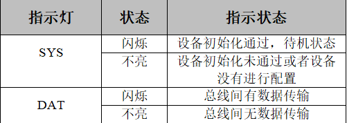 GCAN-206模塊具有1個SYS指示燈,用來指示設(shè)備的運行狀態(tài),1個DAT指示燈,用來指示數(shù)據(jù)傳輸。這2個指示燈的具體指示功能見下表,這2個指示燈處于各種狀態(tài)下時,CAN總線的狀態(tài)如下表所示。GCAN-206模塊指示燈