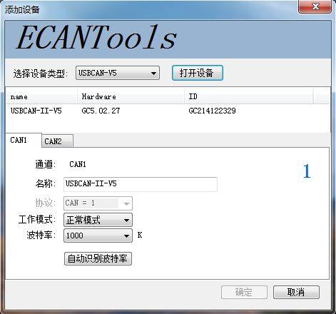 2、選擇對應(yīng)的設(shè)備類型后,點擊“打開設(shè)備”即可在設(shè)備列表中出現(xiàn)已經(jīng)插入電腦USB接口的CAN設(shè)備。