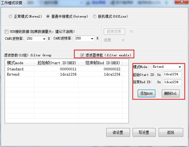 勾選濾波器使能,添加Add,使用中繼濾波功能??梢酝瑫r設(shè)置標(biāo)準(zhǔn)幀或者擴(kuò)展幀,濾波參數(shù)最多12組。如圖中繼濾波配置流程。中繼濾波配置流程